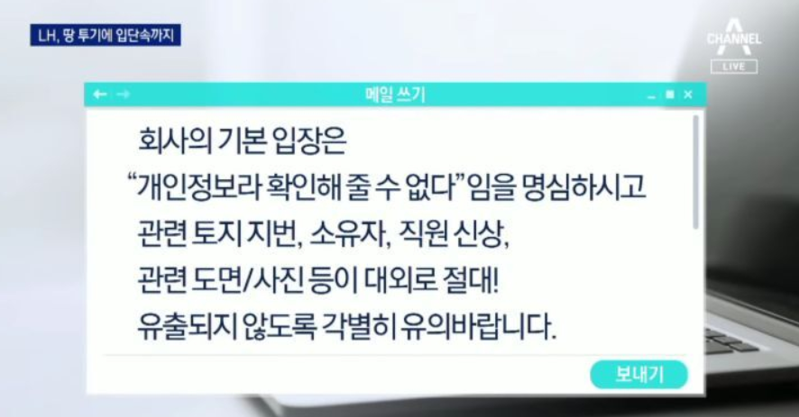 "회사의 기본 입장은 개인 정보라 확인해 줄 수 없다 임을 명심하시고, 관련 정보들을 절대! 대외로 유출되지 않도록 각별히 유의 바랍니다."라는 글을 남겼습니다. 이러한 공문 또 한 언론에 공개가 되었고, 결국 LH 측은 LH 직원들이 땅 투기 사건을 인정할 수밖에 없었습니다.