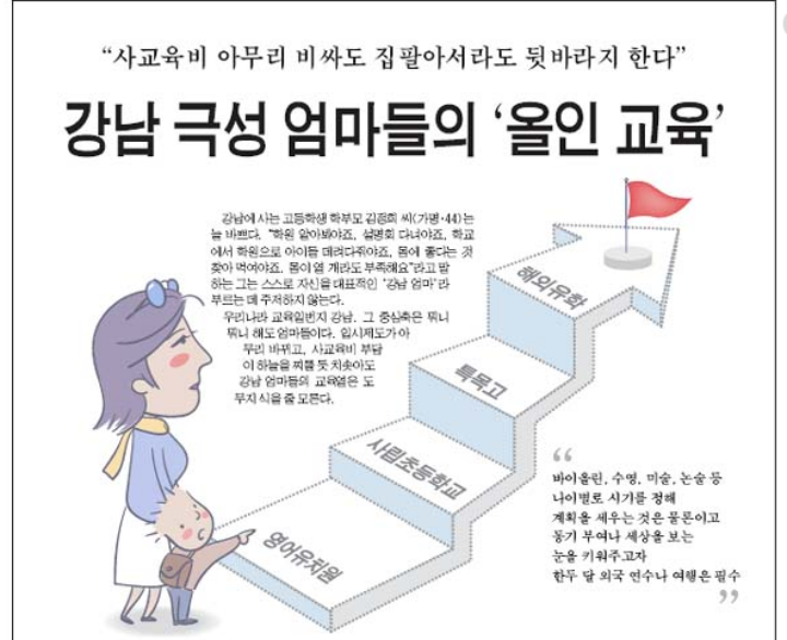 그 이유는 바로 교육 때문이라고 합니다. 어릴때부터 영어유치원, 사립초등학교, 특목고, 명문대, 해외유학을 가는것이 일반적인 교육코스로 알려져 있을 만큼 사교육 열풍이 대단한데요. 그럼 저렇게 사교육을 하지 않으면 되지 않냐? 라고 반문할 수 있지만 실제로 강남에 있는 학생들의 수준이 다르다고 합니다.