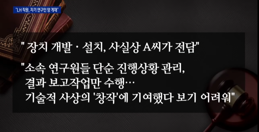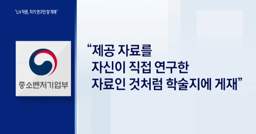 중소 벤처기업부는 LH 연구원 B 씨가 A 씨의 연구 제공 자료를 자신이 직접 연구한 자료인 것처럼 학술지에 게재를 했다며 문제를 지적했습니다. 하지만 LH 측은 연구원 B 씨의 윤리적인 문제를 인정하면서도 기술에 대한 특허 절차는 적법하게 진행되었다는 입장을 내놓았습니다.
