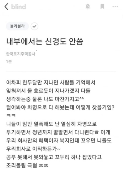 또 한 LH 직원이 이번 땅 투기 사건으로 직장인들이 익명으로 사용하는 앱인 '블라인드'에서 "어차피 내부에서는 신경도 안 쓴다..... 꼬우면 니들도 우리회사로 이직하든가~ " 라는 조롱의 글을 남겨 파문이 일고 있습니다.
