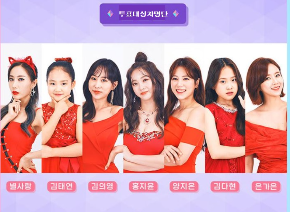 5번 김의영은 체크무늬 티셔츠를입고 귀여운 표정으로 5번의 투표를 독려하고 있으며 6번 김태연은 6번 표를 들고 입술을 내밀며 사랑스러운 표정을 취했습니다. 7번 별사랑은 시크한 표정과 미소로 7번을 투표해주길 기대하는 모습으로 사진을 찍었습니다.