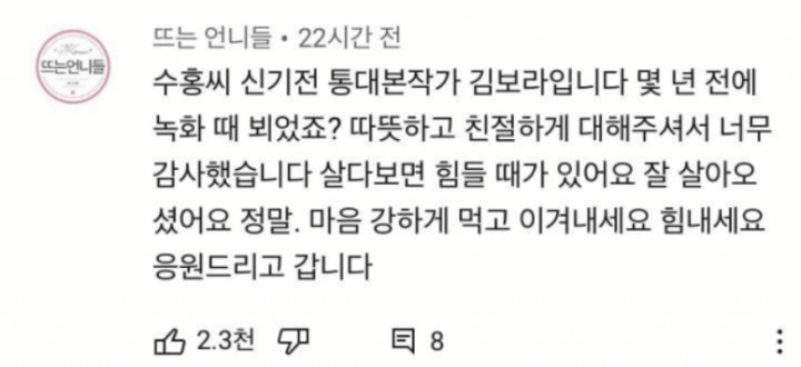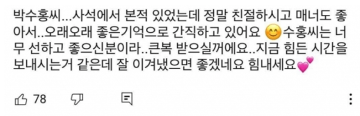 일반인 부터 멜로망스 김민석, 군인, 뷔페 알바생, 함께 프로그램을 한 작가까지 박수홍을 응원하며 미담을 댓글로 달았습니다. 이러한 박수홍 미담만 봐도 박수홍이 평소에 얼마나 착한 사람인지 알 수 가 있는 대목입니다.
