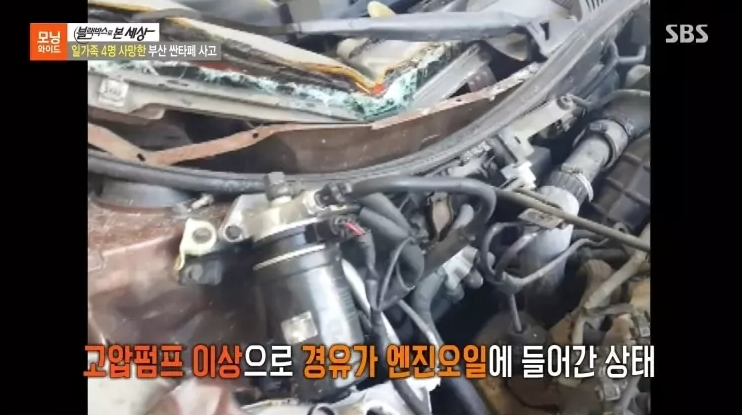 가족들은 차량 전문가에게 차량 점검을 의뢰했고, 사고 차량을 유심히 분석하던 전문가는 고압펌프 이상으로 경유게 엔진오일에 들어갔다고 말했습니다. 그렇게 되면 엔진 오일이 묽어지게 되며 터보가 달린 차들은 엔진오일이 터보쪽으로 올라와 rpm이 급상승하게 된다고 말했는데요.