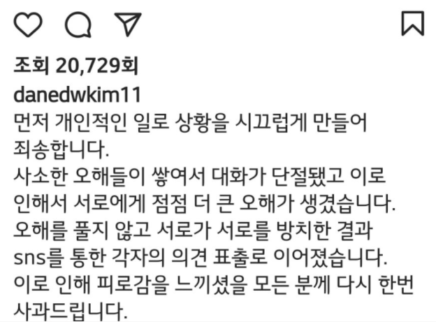 또 한 3주전 부터 미리 스케줄 물어보고 맞추잖아. 문제 해결할 마음 있으면 얘기를 한 번 해보자. 연락할 방법 없으니 태그하고 앤디한테도 얘기해 놓을게. 내일 라이브 초대해줘"라고 덧붙여 신화의 에릭과 김동완이 싸우는게 아니냐며 논란이 일어났습니다. 이에 김동완도 본인의 SNS글에 에릭의 입장에 대한 반박글을 썼습니다.