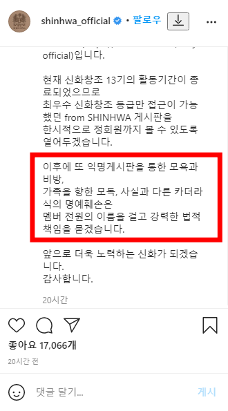 단체 대화방을 통해 회의를 하면서 멤버 모두가 같은 피해를 입은 바 있고 또 이것이 최근까지도 지속적으로 계속되고 있으며 수위도 갈수록 더 심해지고 있다는 것을 파악했다며 앞으로 신화는 익명게시판의 어떤 의견도 수용치 않고 법적대응마저 불사할 것으로 전했습니다.