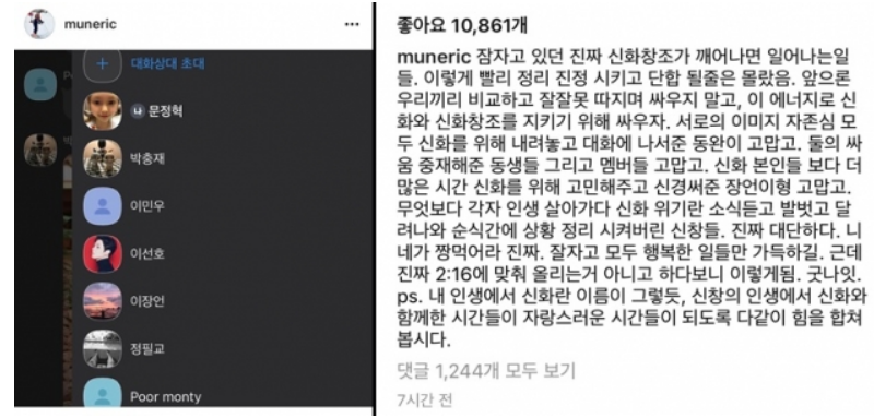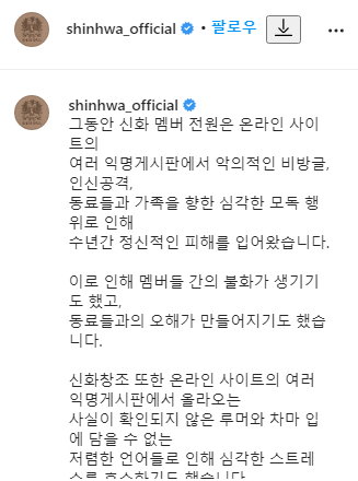 이어서 그룹 신화의 멤버인 에릭과 김동완은 서로 자존심을 내려놓고 진심어린 대화를 하겠다고 전했습니다. 일단 둘 사이의 서운한 점은 서로 화해를 잘 하고 일단락 된 것으로 보여집니다. 신화는 공식 인스타그램을 통해서 그신화 멤버 전원은 온라인 사이트의 익명게시판에서 악의적인 비방글, 인신공격, 동료들과 가족을 향한 심각한 모독 행위로 인해 수년간 정신적인 피해를 입어왔다고 전했습니다.