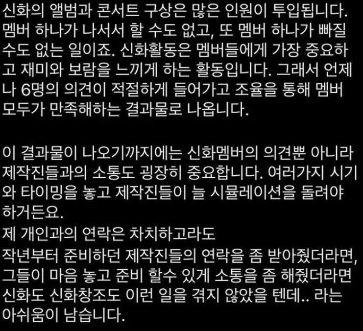 이로 인해 신화 멤버들 간의 불화가 생기기도 했고 동료들과의 오해가 만들어지기도 했다" 라며 글을 남겼습니다. 이어 그렇지만 이 또한 신화의 성장에 도움이 될 거라는 생각을 갖고 수년간 안일한 대처만으로 지내왔었다고 말했습니다. 아무래도 팬들과의 소통을 위해 꾸준히 묵인한 것으로 보여지는데요. 이러한 사태가 곪아 터진 사건이기도 합니다.