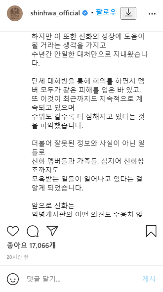단체 대화방을 통해 회의를 하면서 멤버 모두가 같은 피해를 입은 바 있고 또 이것이 최근까지도 지속적으로 계속되고 있으며 수위도 갈수록 더 심해지고 있다는 것을 파악했다며 앞으로 신화는 익명게시판의 어떤 의견도 수용치 않고 법적대응마저 불사할 것으로 전했습니다.