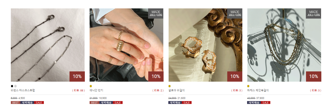 이번 줄로그 하루특가는 크게 3가지 할인율을 적용해서 진행하는데요. 첫번째는 10%할인 제품들입니다. 반지나 벨트, 목걸이, 귀걸이, 마스크스트랩과 같은 악세서리 품목들이 주를 이루고 있는데요. 평소 악세서리가 필요하셨던 분들은 줄로그 하루특가에서 10%를 클릭하신 후 할인 품목들을 살펴보시면 되겠습니다.