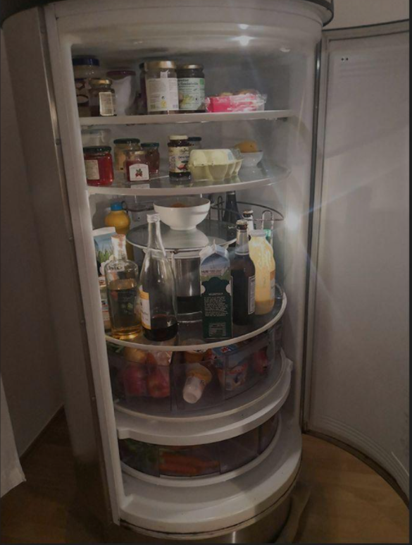 다음은 냉장고입니다. 일반 냉장고는 평면으로 되어있는데 이 냉장고는 특이하게 원형으로 되어있는 모습이 보이시나요? 가끔 냉장고 깊숙히 있는 음식을 찾을 때 구석까지 손이 닿지 않아서 불편할 때가 있는데요.