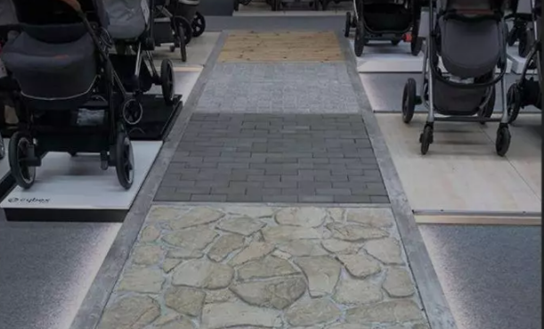 신혼부부들이 임신을 하고 유모차를 살 때 어떤 유모차를 사야할지 고민될때가 많은데요. 특히나 무게나 나가는 아이를 무거운 유모차와 함께 끌어야 하기 때문에 바닥에서 어떤 느낌으로 끌 수 있는지 궁금할 때가 많습니다. 이 매장에서는 각 바닥을 설치해서 구매자들이 유모차를 끌 때 어떤 느낌인지 실험 할 수 있도록 해놨습니다.