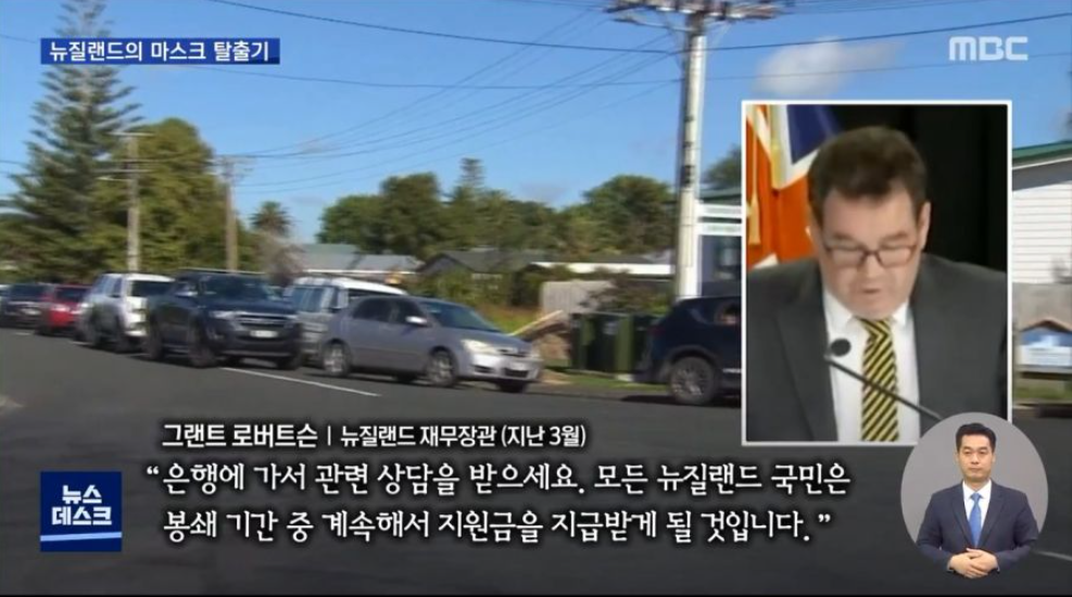 그랜드 로버트슨 뉴질랜드 재무 장관은 뉴질랜드의 전 국민들이 지원금을 받을 수 있도록 은행에 가기를 권고했습니다. 또 한 뉴질랜드 정부에서는 고용주들이 직원들을 해고하지 않고 계속 일을 할 수 있도록 하기 위해 직원들의 급여를 고용주들에게 지급을 했습니다.
